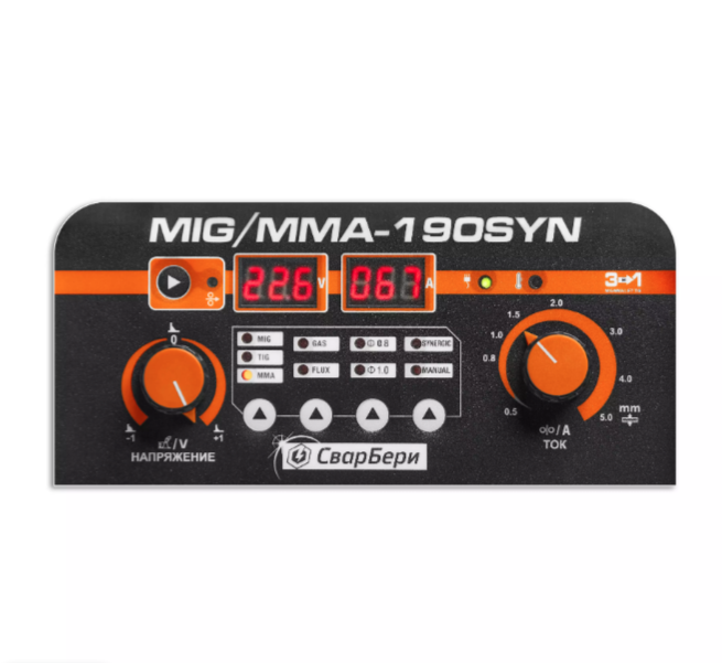 Многофункциональный 3в1 синергетический сварочный полуавтомат (MIG\TIG\MMA) имеет наглядную лицевую панель, которой легко можно выставить необходимые вам режимы сварки. В случае если вы затрудняетесь с выбором параметров то аппарат вам поможет их настроить сам! Достаточно выбрать вид сварки и аппарат сам настроит необходимый ток и скорость подачи. Мощный двигатель всегда «протащит» проволоку в горелке. В результате сварщик полностью контролирует весь сварочный цикл, исключая образования брака, формируя идеальный шов. ММА режим ориентирован на работу с рутиловыми электродами диаметром до 3-4мм. Сварочная горелка подключается посредством евроразъема расположенного на передней панели полуавтомата.Аппарат выдаёт стабильную дугу при падении напряжения до 170В, что особенно важно при работе в отечественных сетях: в гаражах, на загородных участках и т.д.